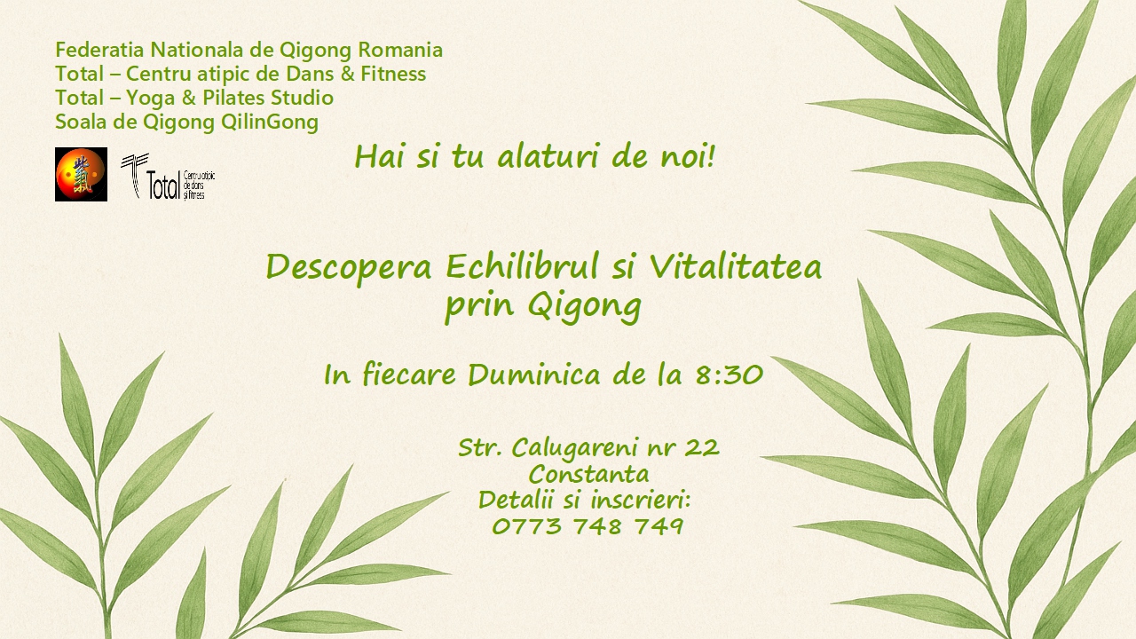 Ofer cursuri și practică de qigong ca trainer acreditat în cadrul Federației Naționale de Qigong din Romania, sub umbrela școlii QilinGong a Maestrului Lin Kai Ting.